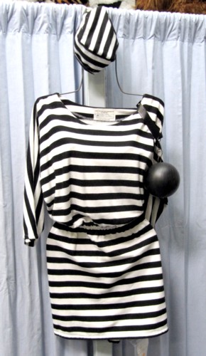 Old fashion prisoner costume. Western, Colonial, 19th Century and early 20th century. Black & White Knit Striped Prisoner Dress, Black & White Striped Hat, Ball & Chain. Ladies Prisoner dress Costume.